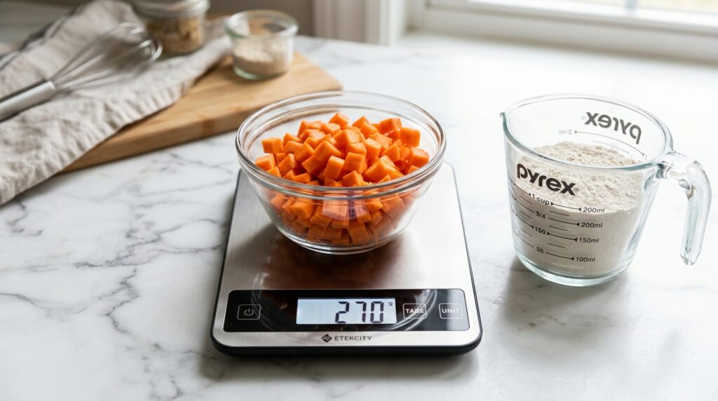 O segredo dos confeiteiros não é medir por “unidades” (3 cenouras médias), mas sim por peso ou xícara. Uma cenoura “média” hoje pode ser o dobro do tamanho de uma de outra época. Se você quer o bolo perfeito, precisa de precisão.